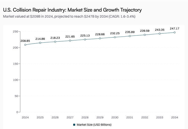 The timing is strategic. While the collision repair industry's five largest consolidators have pulled back on acquisitions in 2025, private equity firms increased their investments, creating new opportunities for independent shops. Collision Partners is entering a market valued at $208.85 billion in 2024, growing to $214.86 billion in 2025, with long-term projections suggesting the sector could reach $247.17 billion by 2034.